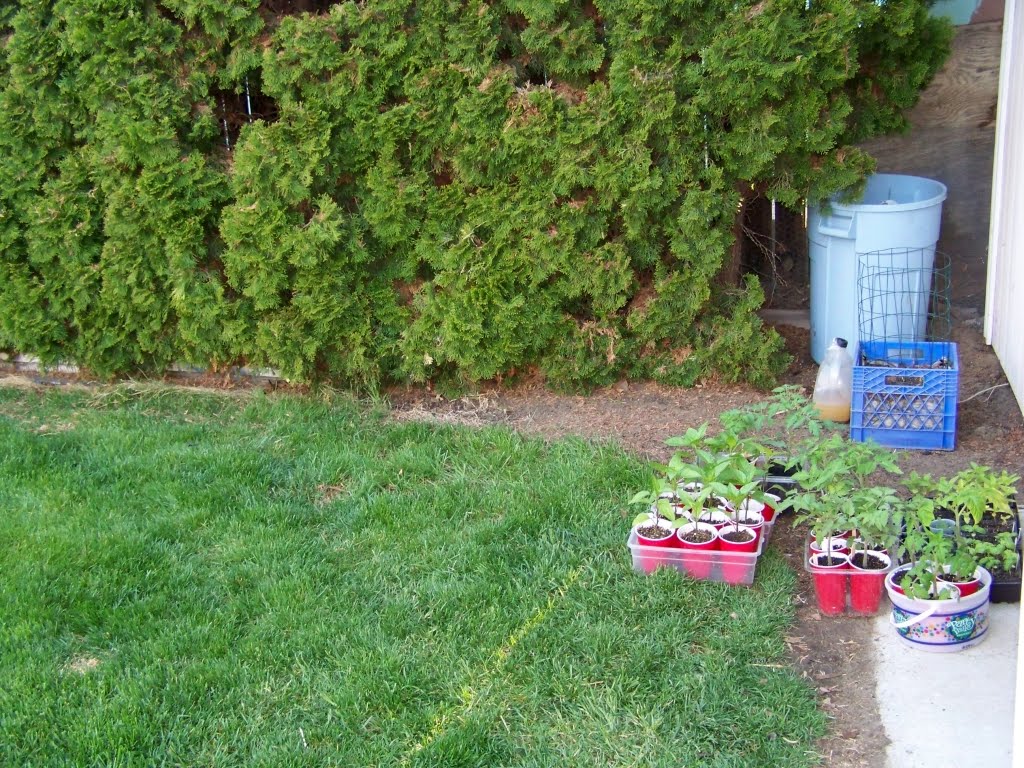 I continued working down the line of arborvitae, raking the winter yuk from underneath, and loading everything in the garden cart for disposal. I found two big concrete stepping stones for the west garden, which will give me places to step to reach the tomatoes in the back of the bed. I set these four Cherokee Purple tomatoes into their buckets, but they are not yet planted. I'll leave them like this for a few days and nights, to get them used to their new surroundings. If temperatures happen to plunge, they can be quickly moved back into the shed.I did get other stuff done, mostly puttering with the drip system in the front yard containers. I was either getting too much water or not enough, I'm having a hard time getting it just right, and I'd like to get these containers planted. One isn't draining at all, even though we used a hole saw to put large drainage holes in the bottom. It must be the brand of potting soil I used, as the other two containers are draining just fine. That means I get to dig it all out and start anew. More holes, different potting mix. I also installed a drip sprinkler in the lettuce garden, behind the shed. It waters with a gentle mist, and doesn't soak the cedar fence like the old sprinkler did.