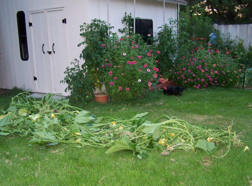 Sunflowers down (click photo to enlarge, and follow the red arrows) . We must have had a good gust of wind this morning, as two of the big sunflowers broke their tethers and fell. The one on the left wasn't broken, so I pulled it back up and tied it to the fence with clothesline. Its top is slightly wilted, but I'm hoping it will survive. The other one (right) was completely broken off and will have to be removed.